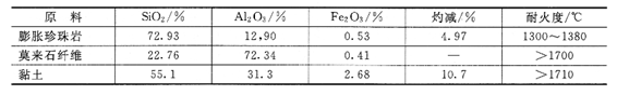 采用聚苯乙烯泡沫球、膨脹珍珠巖粉、莫來石纖維、粘土、硅溶膠作為原料,經(jīng)過擠壓成型制備出的輕質(zhì)保溫隔熱磚。原料成分見表2。